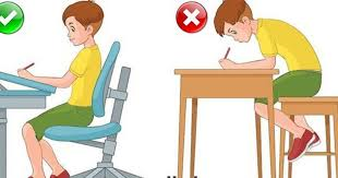 - Đảm bảo đúng tư thế ngồi học; khi ngồi, hai bàn chân được đặt ngay ngắn, vững chắc trên sàn, giữa cẳng chân và đùi tạo thành 1 góc là 900 dao động trong khoảng 75-1050, thân thẳng, đầu và cổ hơi ngả về phía trước, hai tay để ngay ngắn trên mặt bàn. Nếu ngồi học sai tư thế không chỉ gây ra cong vẹo cột sống mà có thể dẫn đến những rối loạn cơ xương khác và nguy cơ mắc tật cận thị.